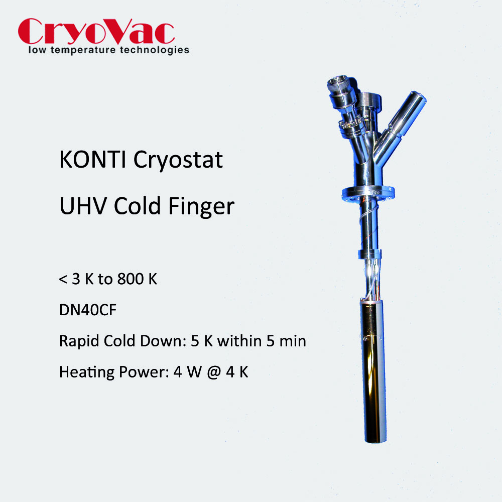 体积紧凑,模块化设计;温度范围:< 3K (65 K) ~500 K;温度稳定性:< 10-4 K;测温计:Si 二极管;5分钟内可冷却到5 K以下;制冷功率>4 W @ 4K;高效冷却辐射罩(利用尾气冷却);加热器功率:50 W;连接法兰:DN40CF;超高真空兼容,烘烤温度:200℃;辐射罩,节流阀端盖等设计均可定制;